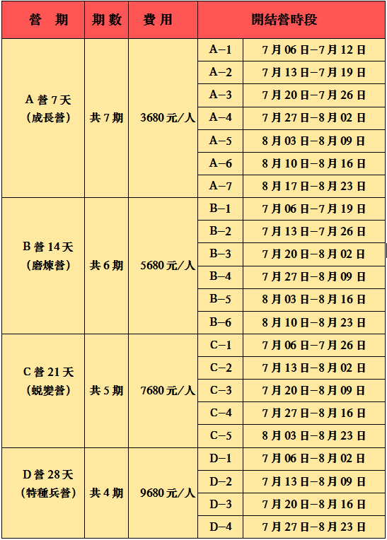 6、教员配置:20至25名学员组成一小队,配一名军事教官,一名生活教官。(分班:小班6—8岁;中班:9—12岁;大班13—16岁)